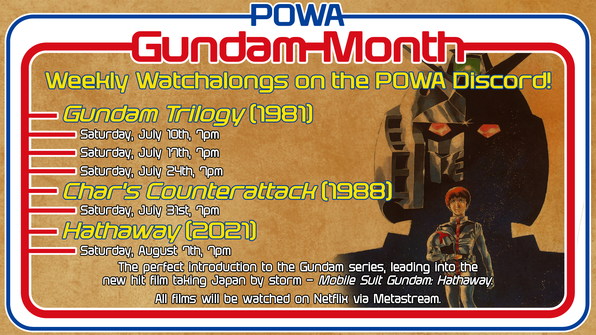 In celebration of the new film – Mobile Suit Gundam Hathaway releasing today on Netflix, POWA is planning to celebrate the legendary mech series with over a month of watchalongs on our Discord server!